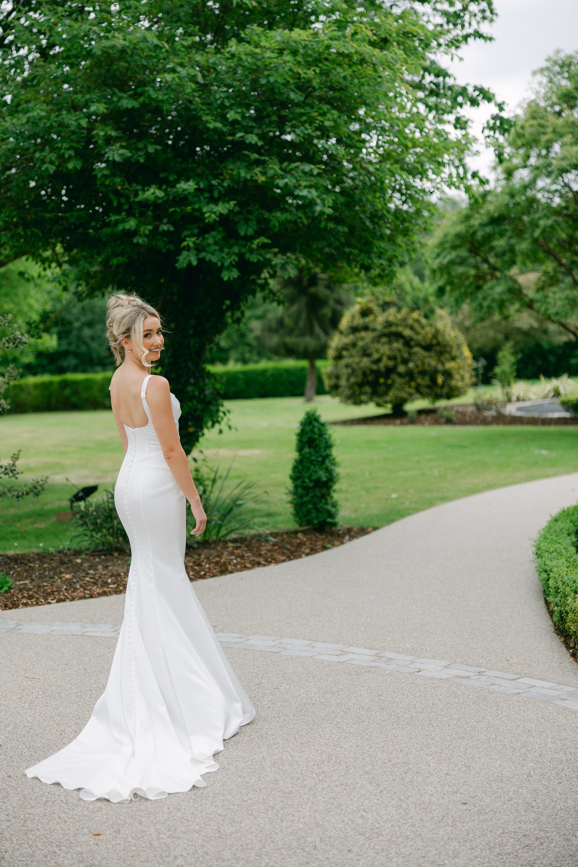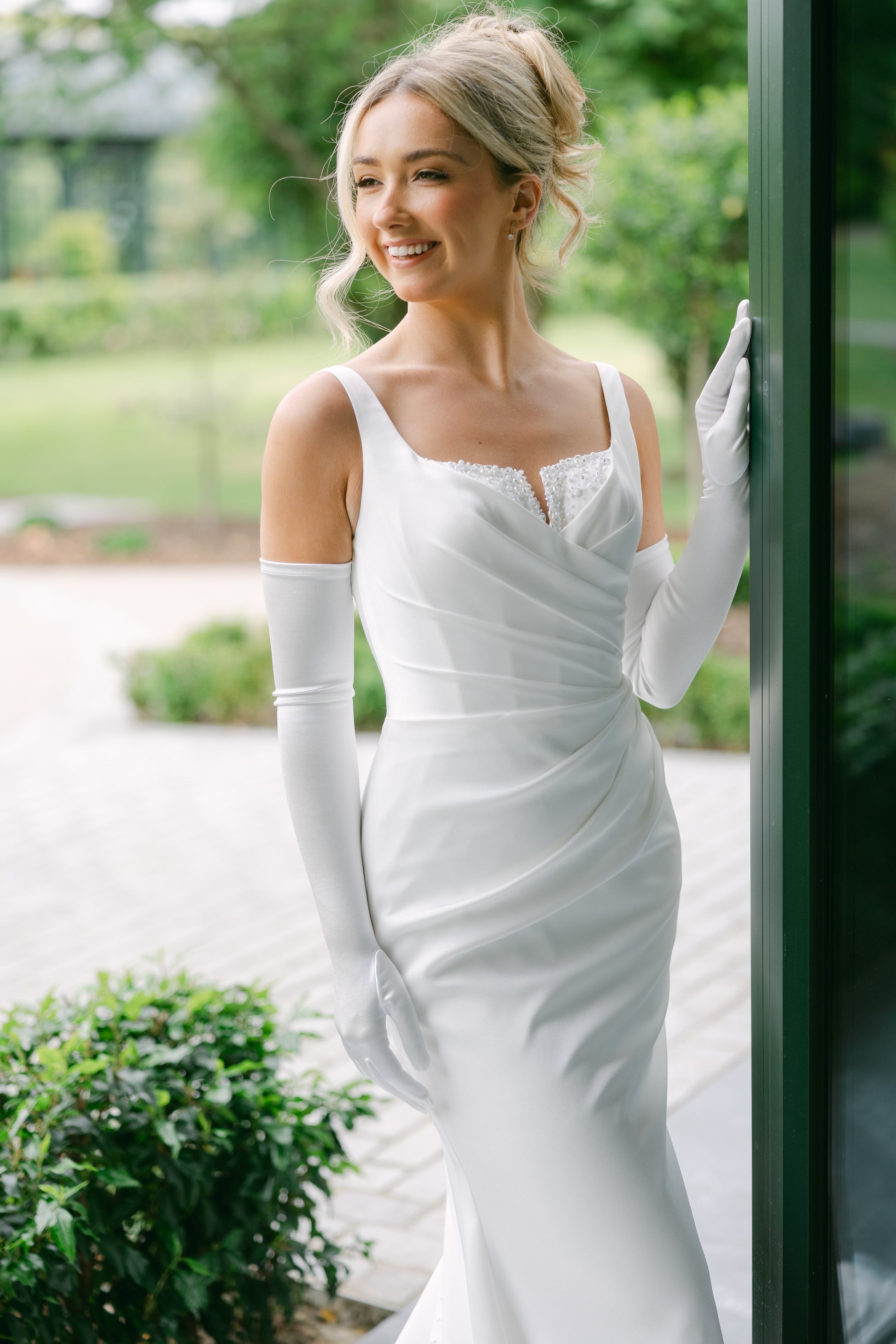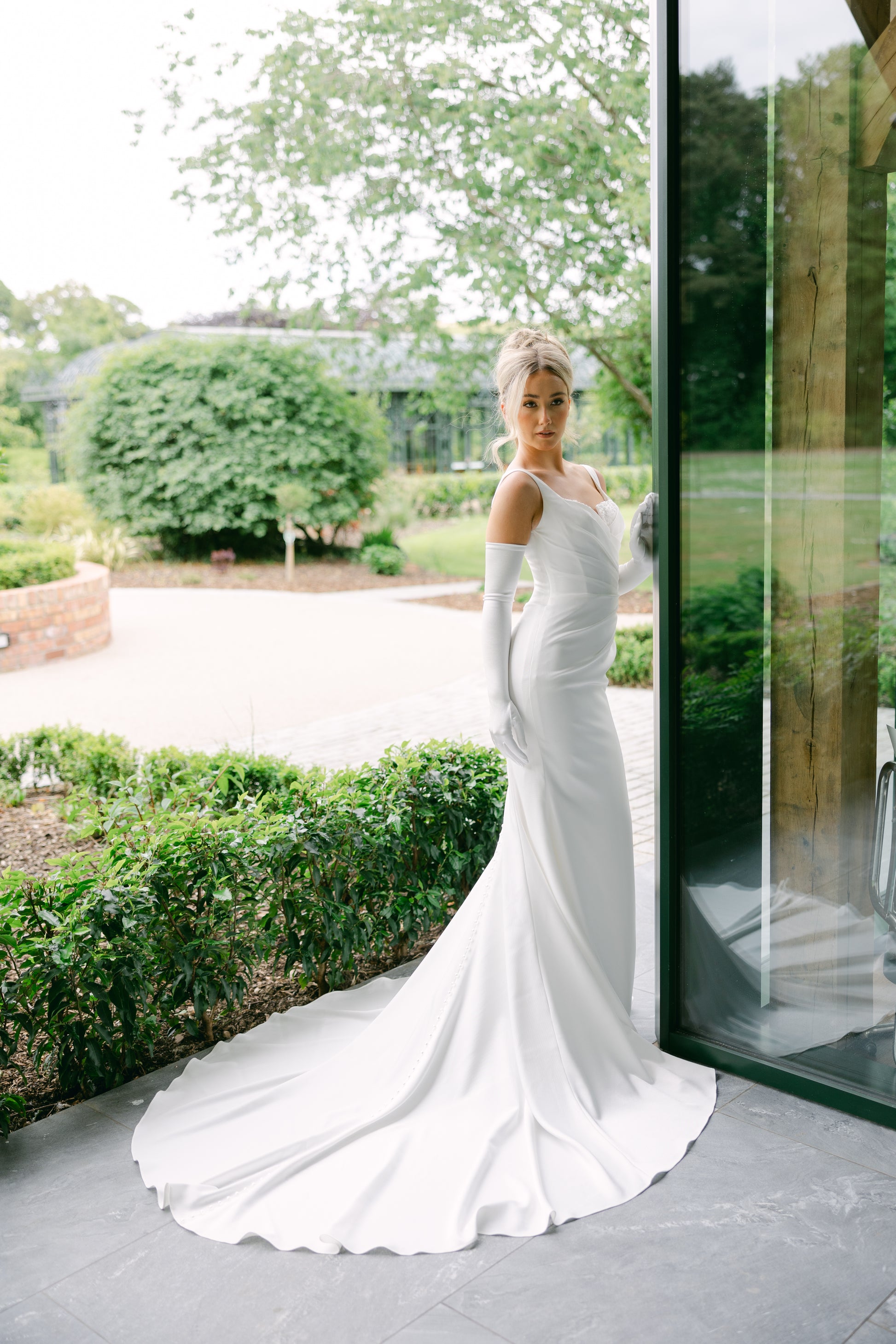 Made it the most beautiful soft Japanese satin crepe, this material will hug the figure and give you the silhouette of dreams on your big day. Paired with its square neckline and pearl detailing, this dress is both timeless elegance, yet trendy and contemporary all at the same time.