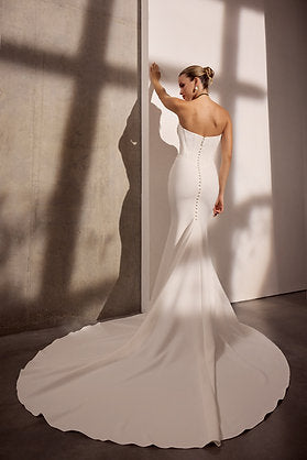Our Savannah wedding dress embodies modern bridal elegance with its expertly corseted strapless silhouette and flattering basque waistline. Crafted in luxurious stretch crepe, this gown features sophisticated draping that accentuates your figure while ensuring comfort throughout your celebration. The exquisite covered button detail adds a touch of timeless refinement to this contemporary design. Each Savannah gown represents Avenue By Josephine Scott's commitment to exceptional craftsmanship and bespoke bridal artistry, ensuring you look and feel extraordinary on your most significant day.