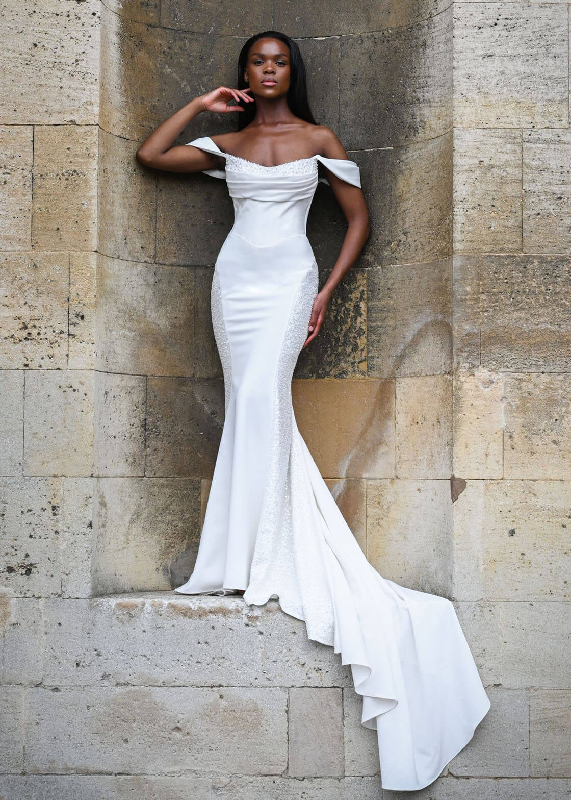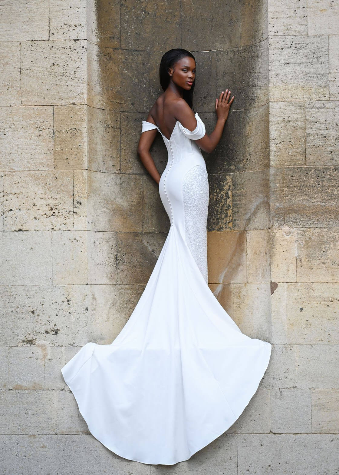 This elegant ivory crepe wedding gown blends classic structure with delicate details. Its strapless bodice is enhanced by a pleated and beaded crumb-catcher neckline, offering refined sophistication. Subtle sparkle and beaded panels along the skirt introduce graceful movement and understated glamour. The back features crepe-covered buttons halfway down for a timeless finish. Detachable Bardot sleeves provide versatility, allowing seamless style transitions from ceremony to celebration. Designed for both comfort and elegance, this fit-and-flare dress presents a modern yet enduring bridal silhouette.