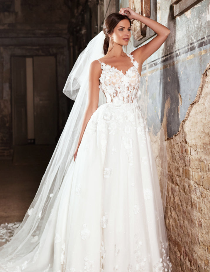 The Dolores wedding dress by White & Lace, Milla Nova is a breathtaking high-neck gown adorned with intricate floral appliqué and shimmering details. Its skirt features layers of tulle that come together to create a dreamy princess bride look. The addition of tulle sleeves and floral appliques adds a touch of elegance, making this gown perfect for brides seeking a romantic and timeless style.