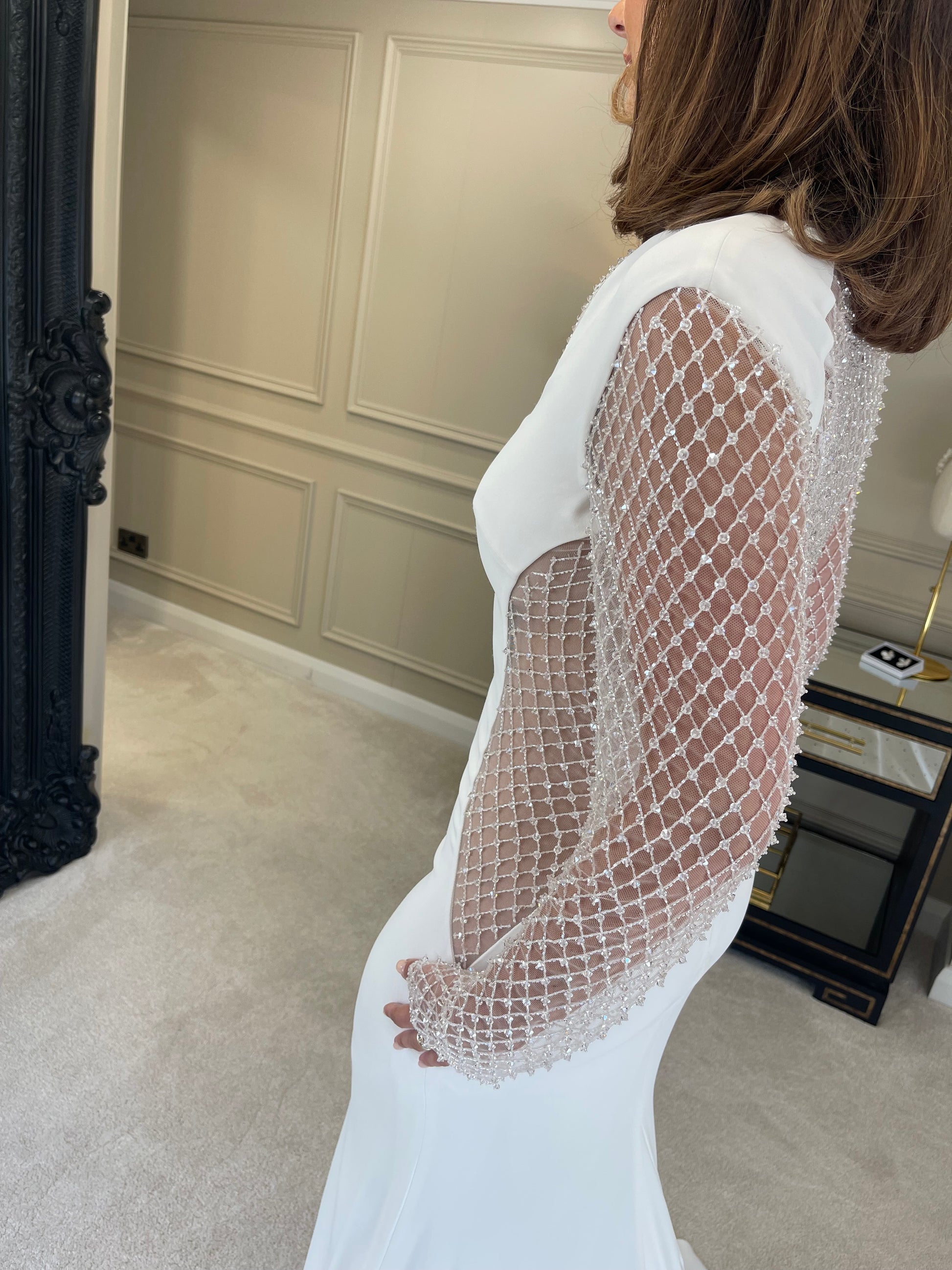The beaded sleeves and side beading on the waistline add a touch of opulence and glamour to the dress, elevating its overall allure. One of the most striking features of the Pronovias Atelier Divinity dress is its stunning scalloped neckline, which adds a touch of whimsical charm to the ensemble.