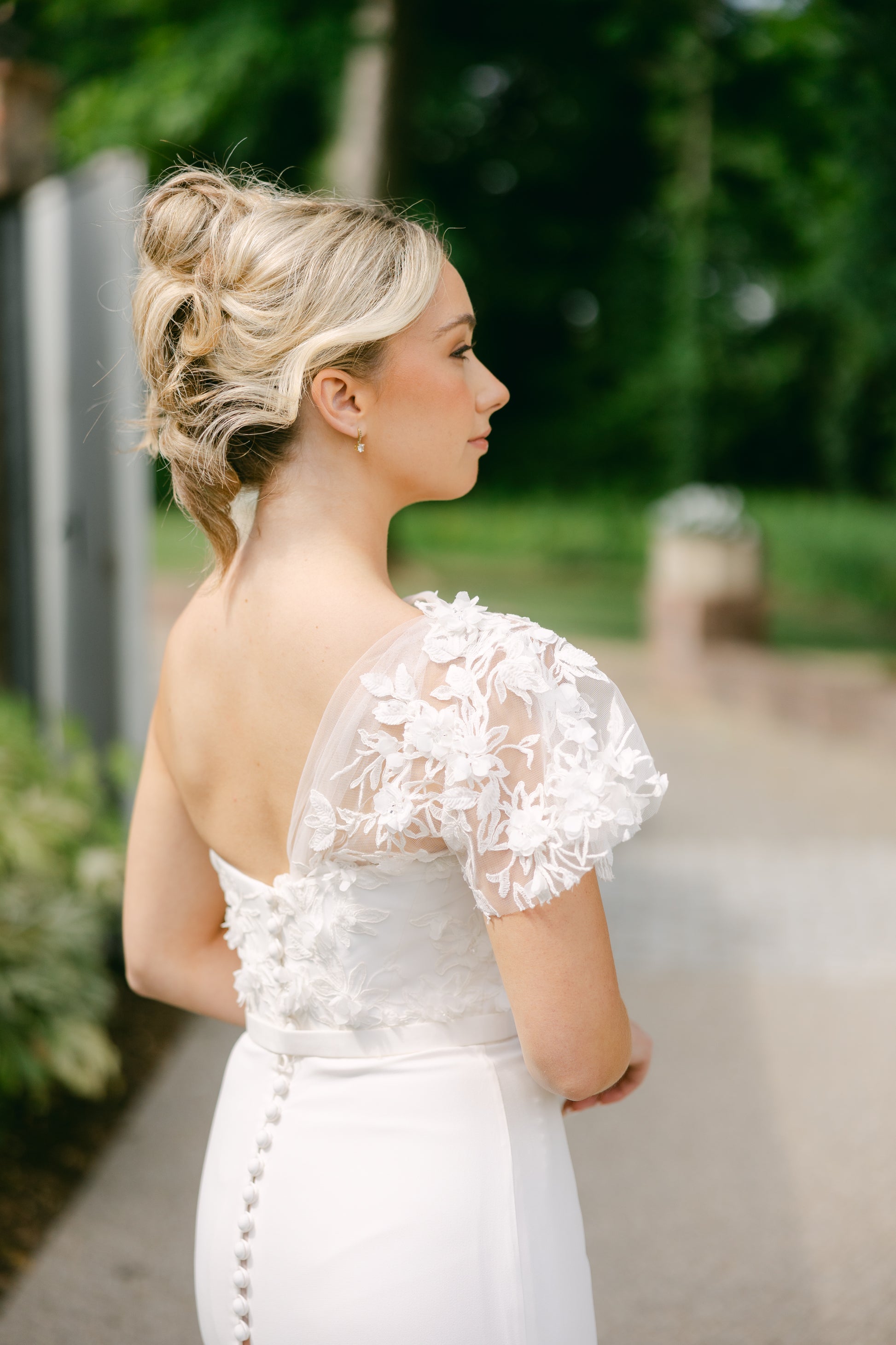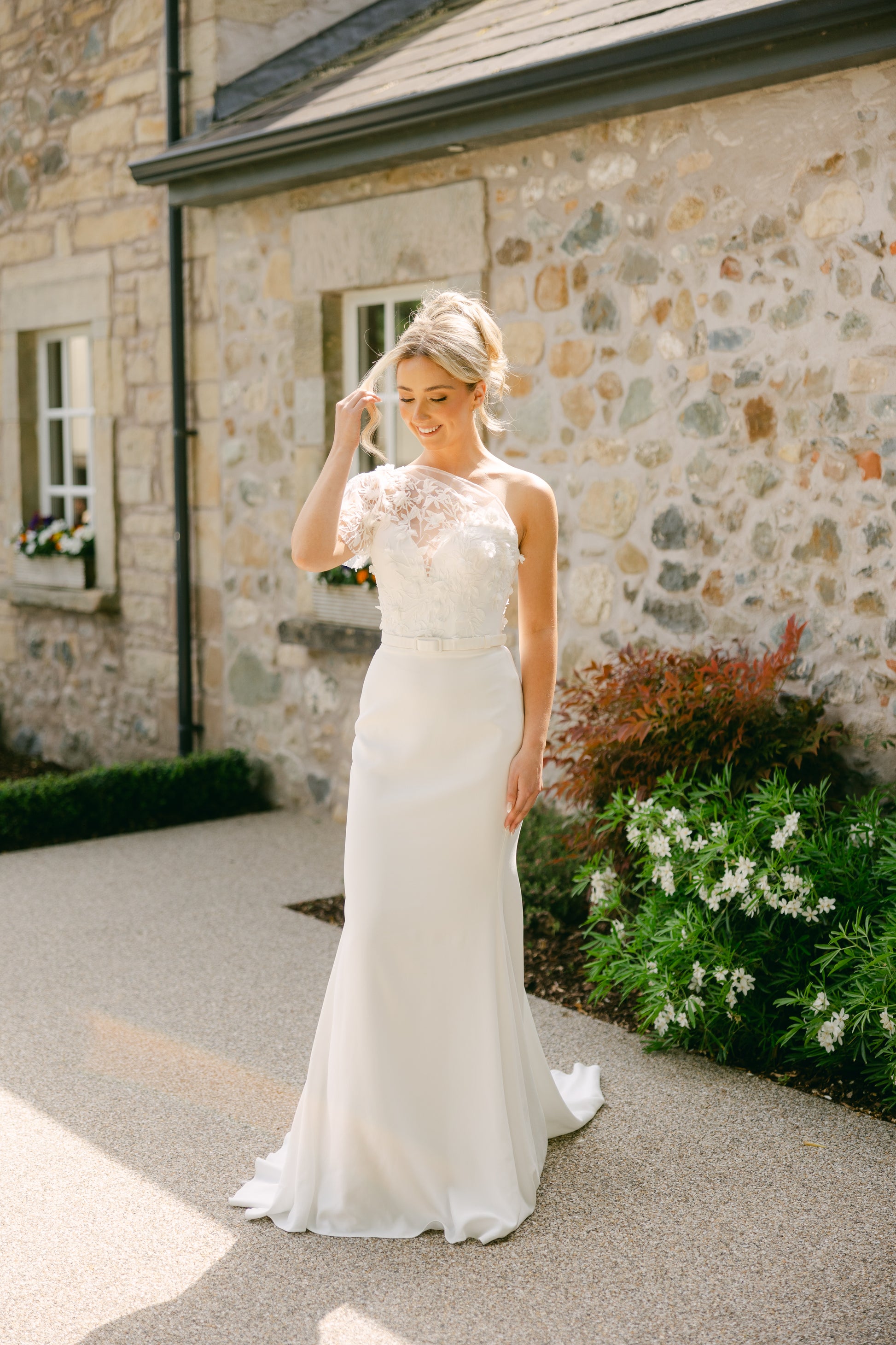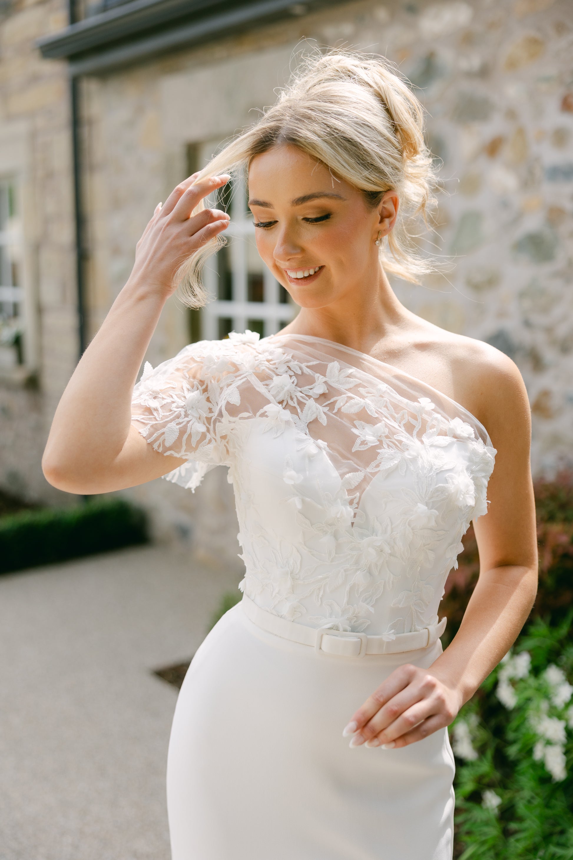 The Suzanne Neville 2025 Hibiscus wedding dress is an exquisite and elegant gown that embodies timeless sophistication. Crafted with luxurious crepe fabric, this dress boasts a fitted silhouette that accentuates the feminine form with grace and poise. The floral overlay bodice adds a touch of romance and whimsy to the design, elevating it to a truly ethereal piece. The one-shoulder style neckline exudes modernity and allure, showcasing a hint of skin while remaining tasteful and refined. The asymmetric neckline adds a contemporary twist to the classic bridal look, making it a perfect choice for the fashion-forward bride who seeks a blend of tradition and avant-garde elegance. The intricate floral overlay on the bodice creates a stunning focal point, drawing the eye to the intricate details and adding depth and dimension to the gown. The delicate floral motifs lend a sense of natural beauty and charm to the dress, evoking a sense of romance and femininity. The sleek and minimalist crepe fabric drapes flawlessly, creating clean lines and a polished finish that exudes understated glamour. The simplicity of the crepe serves as the perfect canvas for the elaborate floral overlay, allowing the details to shine and capture attention without overwhelming the overall aesthetic. The 2025 Hibiscus wedding dress by Suzanne Neville is a testament to the designer's impeccable craftsmanship and attention to detail. Every element of the gown is meticulously executed, from the precision of the tailoring to the artful placement of the floral embellishments, resulting in a masterpiece that exudes luxury and sophistication. This dress is a true statement piece that is sure to leave a lasting impression as the bride glides down the aisle. Its timeless beauty and modern sensibility make it a versatile choice for a range of wedding styles, from classic and traditional to contemporary and chic. In summary, the Suzanne Neville 2025 Hibiscus wedding dress is a captivating blend of classic elegance and contemporary allure. With its fitted crepe silhouette, floral overlay bodice, and one-shoulder neckline, it is a masterpiece of design that embodies romance, sophistication, and modernity, making it a standout choice for the discerning bride.